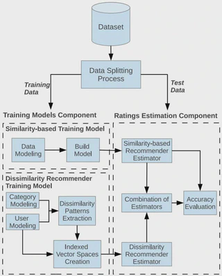 Collaborative recommenders rely on the assumption that similar users may exhibit similar tastes while content-based ones favour items that found to be similar with the items a user likes. Weak related entities, which are often considered to be useful, are neglected by those similarity-driven recommenders. To take advantage of this neglected information, we introduce a novel dissimilarity-based recommender that bases its estimations on degrees of dissimilarities among items’ attributes. However, instead of using the proposed recommender as a stand-alone method, we combine it with similarity-based ones to maintain the selective nature of the latter while detecting, through our recommender, information that may have been overlooked. Such combinations are established by IANOS, a proposed framework through which we increase the accuracy of two popular similarity-based recommenders (Naive Bayes and Slope-One) after their combination with our algorithm. Improved accuracy results in experimentation on two datasets (Yahoo! Movies and Movielens) enhance our reasoning. However, the proposed recommender comes with an additional computational complexity when combined with other techniques. By using Hadoop technology, we developed a distributed version of IANOS through which execution time was reduced. Evaluation on IANOS procedures in terms of time performance endorses the use of distributed implementations.